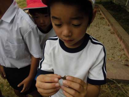 虫を捕えることは難しいようでしたが、いろいろな虫を追いかけたり、鳴き声を聴き取ったりして小さな自然とふれあうことができました。