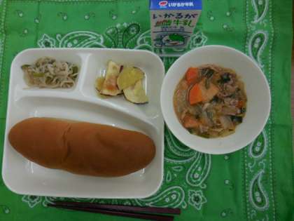 献立は、豚肉といかの中華煮、さつまいもの甘蜜かけ、もやしとピーマンの炒め物、パン、牛乳でした。