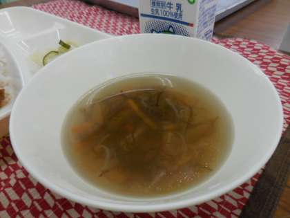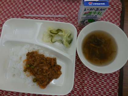 献立は、タコライス、もずくと白ネギのスープ、キャベツときゅうりのサラダ、牛乳でした。