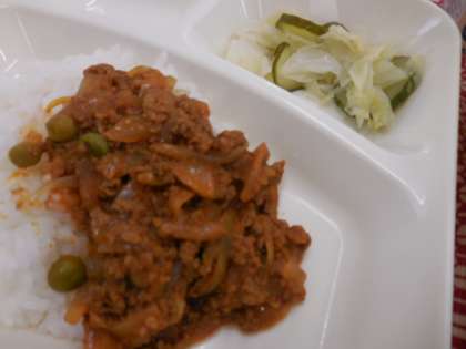 タコライスは、牛ひき肉、豚ひき肉、たまねぎ、グリンピースを炒めて味付けをし、ごはんにかけたものです。しっかりとしたよい味加減で、とてもおいしくいただきました。