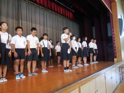 校長、生活指導担当の話の後、前期児童会運営委員・代表委員の退任の代表あいさつと後期児童会運営委員・代表委員の決意を込めた一人ひとりのあいさつがありました。