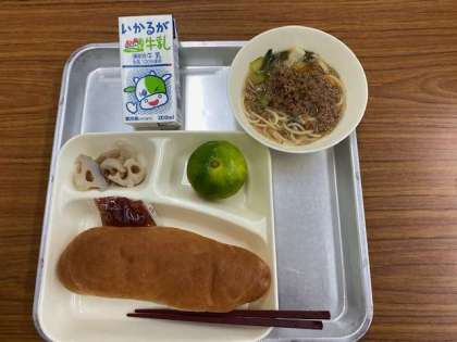 今日の給食は、タンタンめんとれんこんのオイスターソース焼き、コッペパン、みかん、牛乳でした。タンタンめんは中国の四川料理を代表するめん料理の一つです。今日の給食のタンタンめんは、チンゲン菜やもやし、にんじん、中華めんの入ったスープの上に味つけしたひき肉をのせて食べます。子どもたちにも大好評でした。