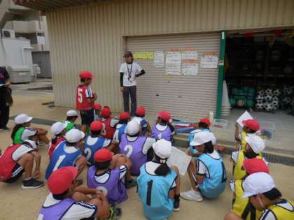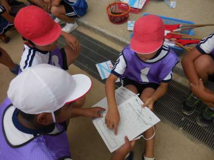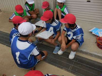 各班ごとに集まって、めあてについて自己評価したり、相互評価したりしています。