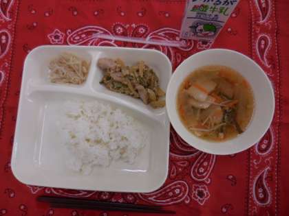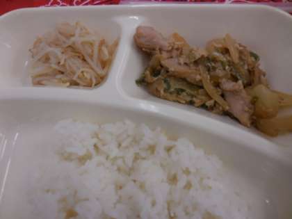 献立は、鶏肉のごまだれ焼き、ソーキ汁、もやしのしょうが醤油あえ、ごはん、牛乳でした。