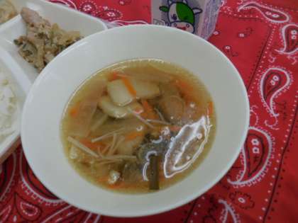 ソーキ汁は沖縄料理の一つでソーキ(豚のあばら肉)を昆布、だいこんなどと、一緒に煮込んだ汁物です。汁はあっさりしているけれどこくがあり、とてもおいしくいただきました。