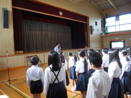 臨時の児童朝会を行いました。その初めに今般の台風19号により被災された皆様に哀悼の意を表するとともに黙とうを捧げました。