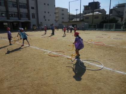 いったん集まって、今日のめあてを確認した後に「スーパーワープタイム」にのぞみました。自分たちで小型ハードルを置くなど、走路を整え必要に応じて記録をとりながら40mの小型ハードル走にチャレンジしていました。