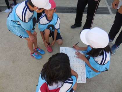 全力を出し切った「スーパーワープタイム」が終わり、各班ごとに今日の学習を振り返って話し合い、最後に全体の場で互いの良さを認め合う内容の発表していました。