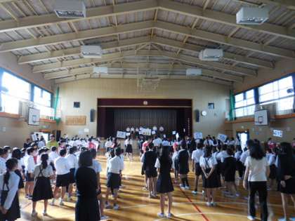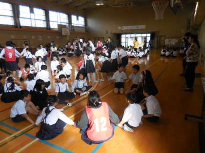 8時30分には、全校児童が講堂に集まり、各縦割り班ごとに整列しています。