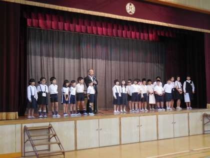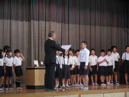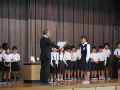 児童朝会では、10月14日に野里小学校で行われた「西淀川区ミニバスケットボールスポーツ交歓会」の表彰を行いました。