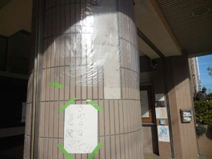 PTA副会長より教頭に連絡が入り、すぐに教頭が駆けつけて現場確認・検証を行い、応急の措置をしました。同様のタイルが、校内に数か所円形の柱にはられています。すべて、目視を行い叩いてみましたが、すぐに剥落することはないようです。