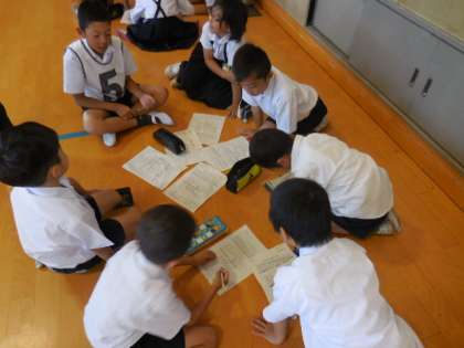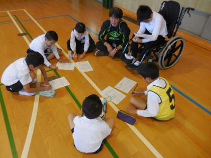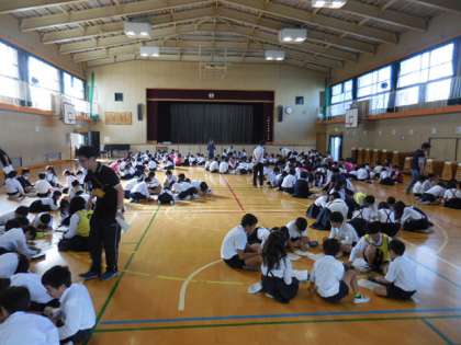 各登校班ごとに、班のリーダーのビブスの色や番号の確認、前後半で講堂、運動場に分かれて活動する順序の確認などを行いました。
