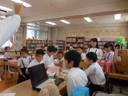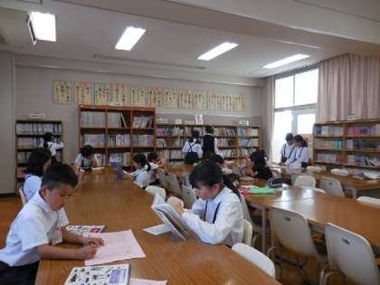 昼休みは、運動場へ出る子どもも多い中、図書委員会からの呼びかけで図書館へも多数の児童が来ています。
