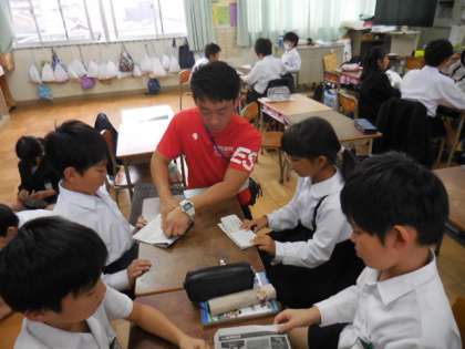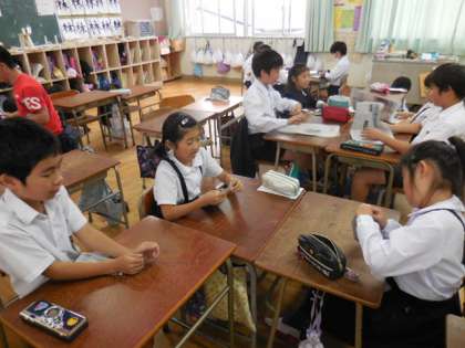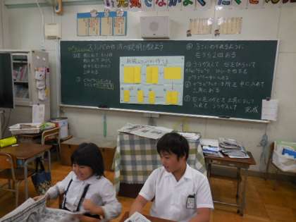 明日、10月26日の土曜授業で行う防災教室に向けて、4年2組では新聞紙で作るスリッパの手順を確かめていました。