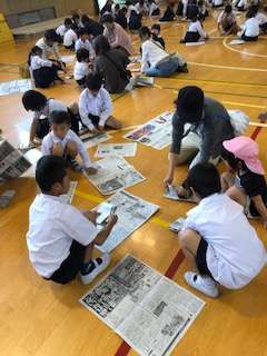 実際に新聞スリッパを各自で作っています。