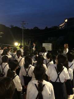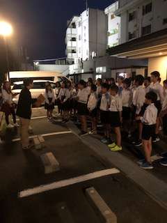 避難訓練を行いホテル玄関前の駐車場に集まりました。子どもたちの行動は速やかでした。
