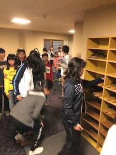 食事会場へ向かっています。途中に水筒を預けるところがありました。