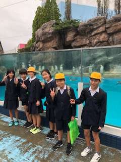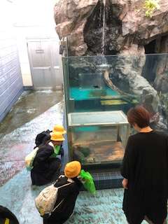 コツメカワウソ、先ほどのペンギンパレードに出ていたフンボルトペンギンの水槽を見学しています。