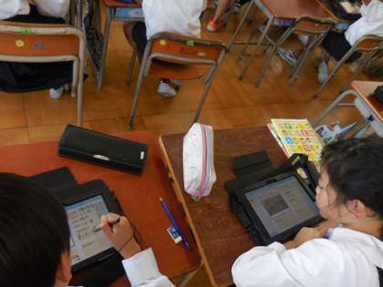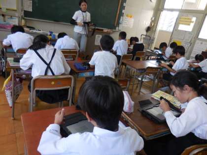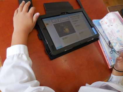 4年生の子どもたちもタブレット端末の扱いに十分慣れており、担任やICT支援員の助言を踏まえ手際よく編集していました。