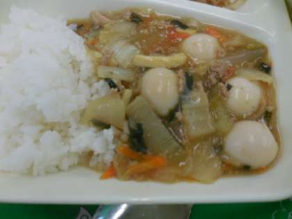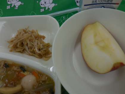 11月に入って初日の献立は、中華丼、もやしの中華あえ、りんご、牛乳でした。
