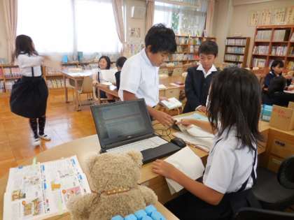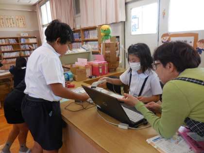天気がとてもよくて運動場で遊ぶ子どもが多い中、本の貸し出しに来る子どももいます。