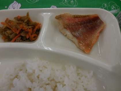 献立は、赤魚のしょうゆだれかけ、みそ汁、きんぴらごぼう、ごはん、牛乳でした。