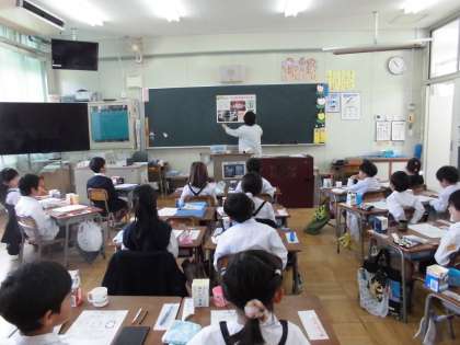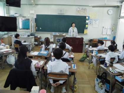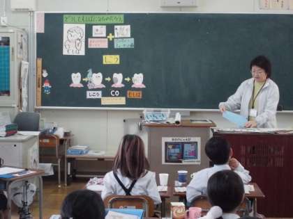 3時間目は1組が、4時間目は2組の子どもたちが養護教諭による歯磨き指導を受けました。
