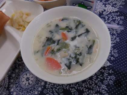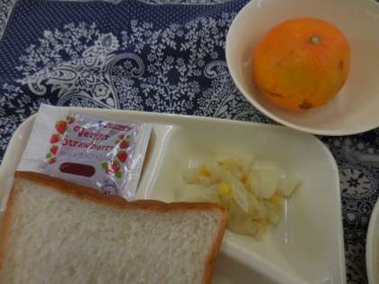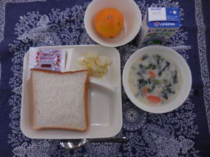 献立は、ホタテガイのクリームシチュー、キャベツとコーンのサラダ、ミカン、ジャム、パン、牛乳でした。