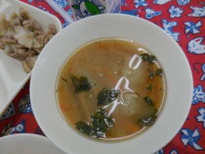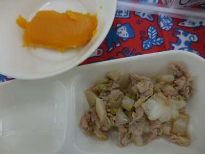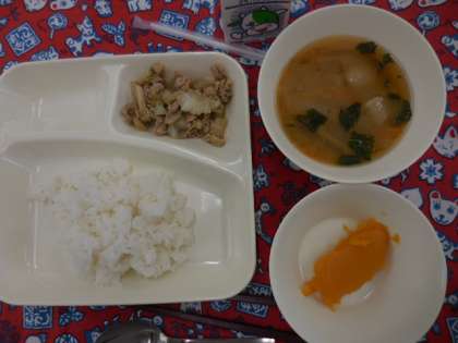 献立は、豚肉とまいたけの炒め物、つみれ汁、かぼちゃういろう、ごはん、牛乳でした。