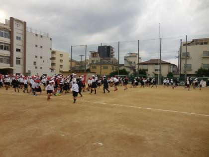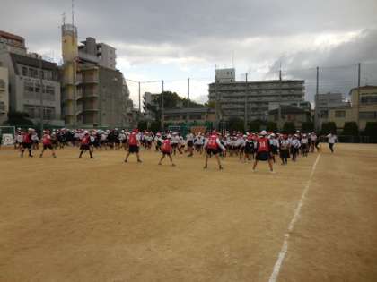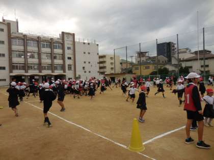今朝は、運動場で「通り抜けオニゴッコ」をしました。