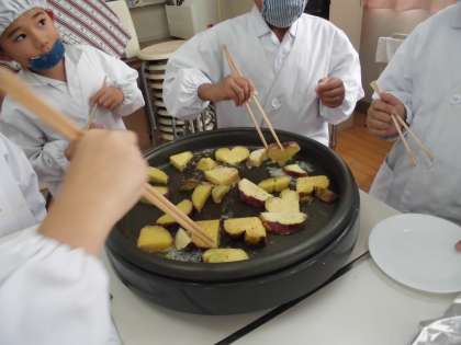 あらかじめふかしておいたサツマイモを子どもたちが薄く切り分けて、ホットプレートに並べてバターで炒めました。