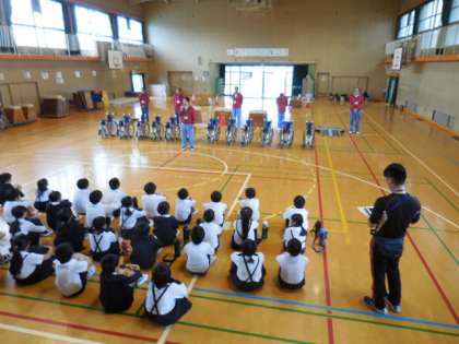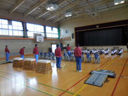 講堂で、あいさつをした後、今日の活動の説明や障がい者に関わる話、車いすの取り扱い等についての説明がありました。