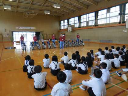 車いすも学校まで運んでいただき、4年生児童全員が車いすの自走体験と介助体験をします。