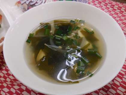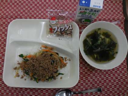 献立は、ビビンバ、わかめスープ、アーモンドフィッシュ、牛乳でした。