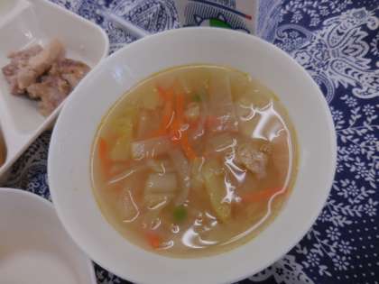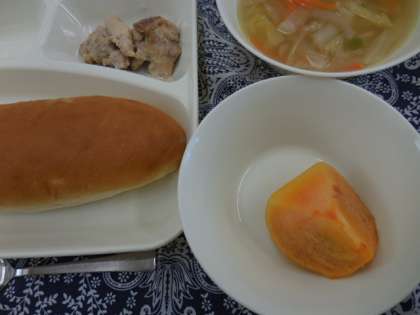 献立は、鶏肉のガーリックマヨネーズ焼き、スープ、柿(富有柿)、パン、牛乳でした。