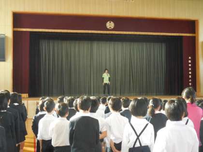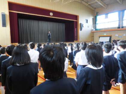 校長からの話の後、栄養教諭から生活チェック週間に関わる話、生活指導担当からは、生活指導強調週間で廊下階段歩行の約束をよく守った学年の紹介や決まりを守ることについての話がありました。