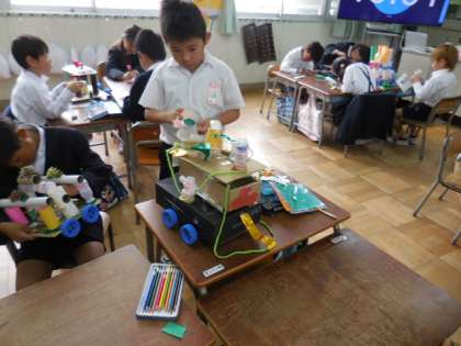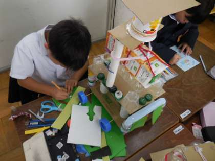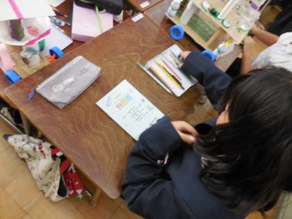 作品を仕上げた子どもたちは、作品展のしおりに色を塗ったり、招待の言葉を書きこんだりしていました。