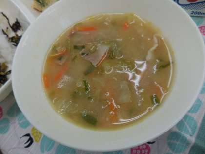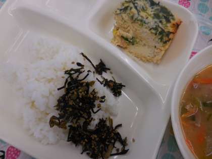 献立は、千草焼、みそ汁、ごまひじき、ごはん、牛乳でした。