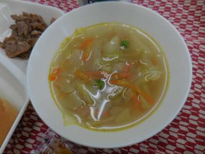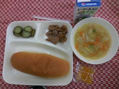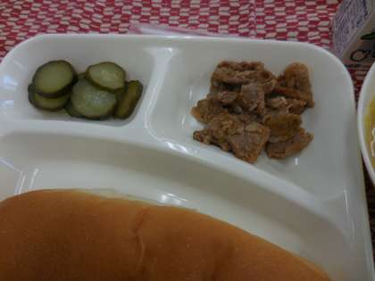 献立は、豚肉のデミグラスソース、スープ、きゅうりのサラダ、マーマレード、パン、牛乳でした。