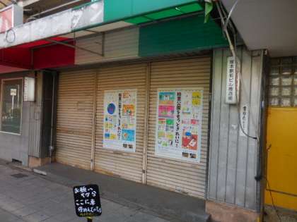 そのポスターが大きな2枚の紙にまとめられて、駅前公園前のシャッターに掲示されています。