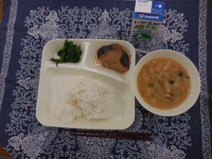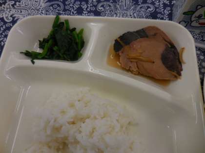 献立は、なまりぶしのしょうが煮、みそ汁、ほうれんそうのおひたし、ごはん、牛乳でした。