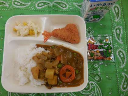 今日のカレーライスは、エビフライがついており、いつも以上においしくいただきました。ラッキーにんじんも入っているので、当たった人はさらに幸せな気分になれることでしょう。