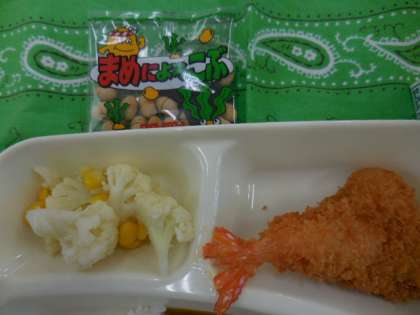 献立は、エビフライカレーライス、カリフラワーのピクルス、豆こんぶ、牛乳でした。
