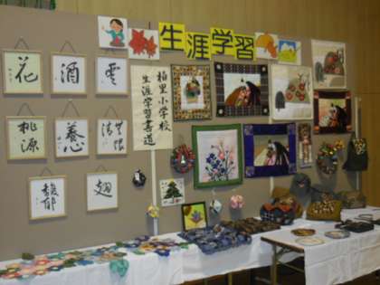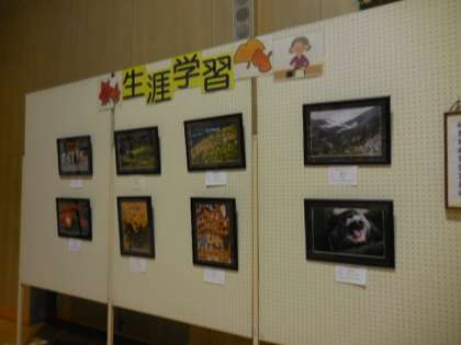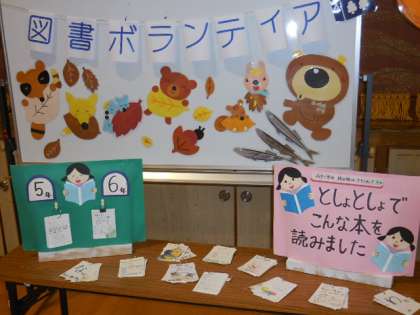 生涯学習ルームの作品、図書館ボランティア「本の森・としょとしょ」の展示です。