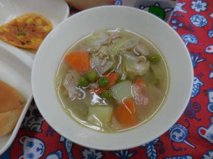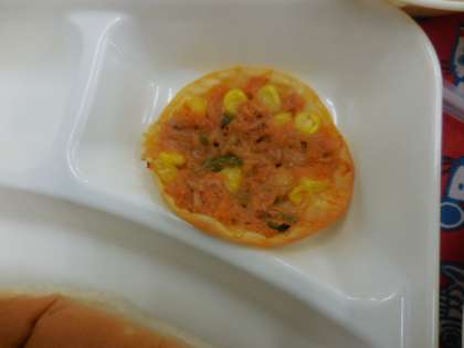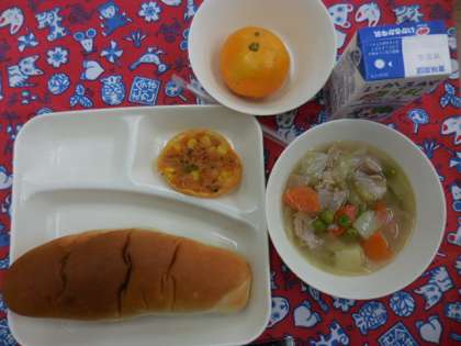 献立は、豚肉とキャベツのスープ煮、変わりピザ、みかん、パン、牛乳でした。