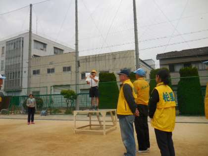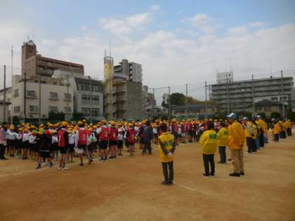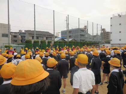 全校児童が運動場に集まり、校長、児童代表、地域代表の方のあいさつがありました。