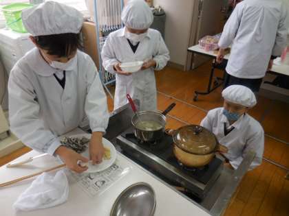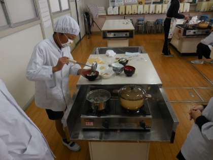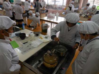 家庭科室で「ごはんとみそ汁」の調理実習をしていました。