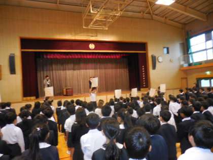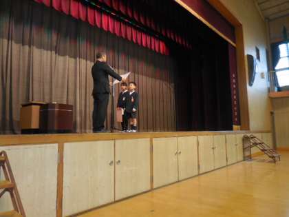 児童朝会では、転入児童の紹介、校長の話に続いて、納税に関する習字・防火予防図画の表彰、運動委員会からのなわとび大会についてのお知らせ、看護当番からは12月の生活目標、保健給食目標についての話がありました。