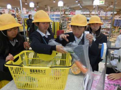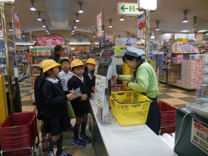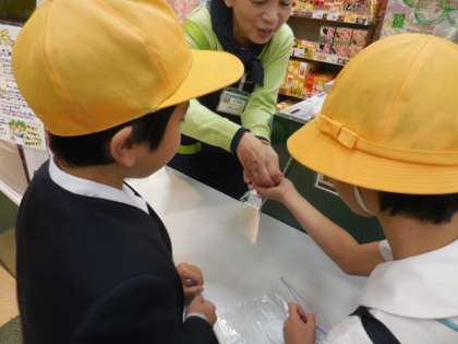 レジを通って、品物を確かめて一つ一つていねいにビニル袋に入れています。おつりも間違いがないかどうかしっかりと確かめました。