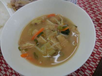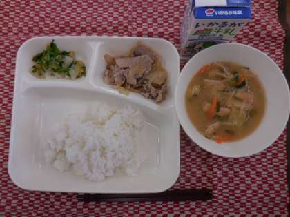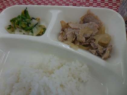 献立は、豚肉の生姜焼き、さつまいものみそ汁、菊菜と白菜のごまあえ、ごはん、牛乳でした。